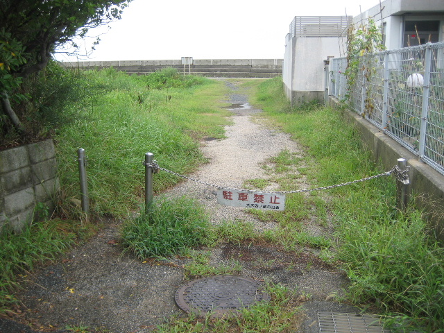常盤海岸の護岸が見えている。ポストにはチェーンが張られており車で外へ出ることはできない。