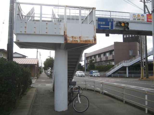 陸橋の昇降口が歩道上にあり、駅出入口となる本路線の続きはそのすぐ背後にある。大沢西交差点を通過し、常盤駅への矢印付き標識を眺めて「この先だな…」でスピードを落とすようでは全然間に合わない。