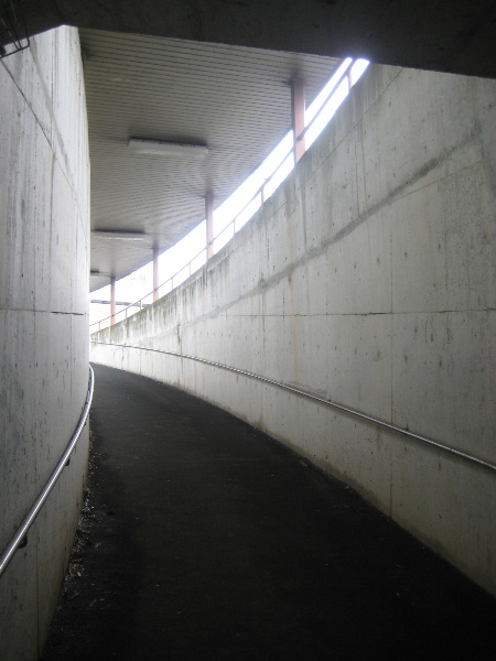 自転車も通れるが、下りスロープで加速し危険なので押し歩きが求められる。