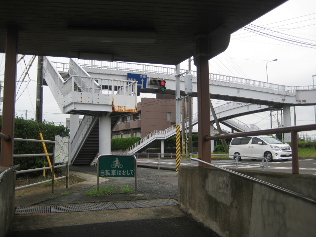 陸橋に取り付けられた案内板が見えている。