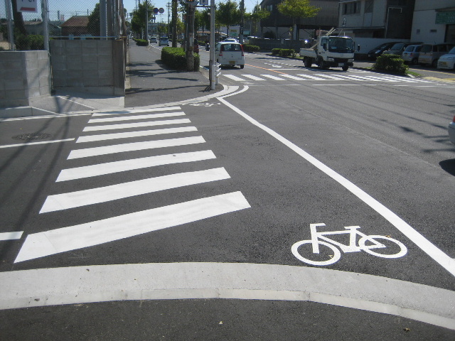 横断歩道部分にカメラを向けている。アスファルトが新しく被せられ、自転車通行帯やゼブラも新しくペイントし直されている。
