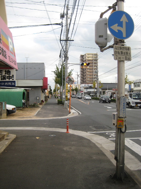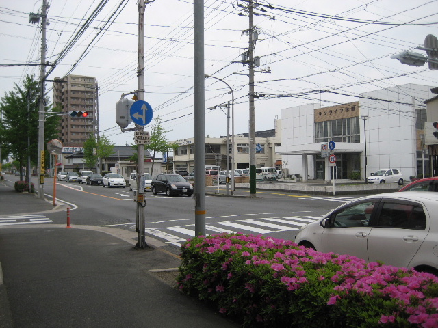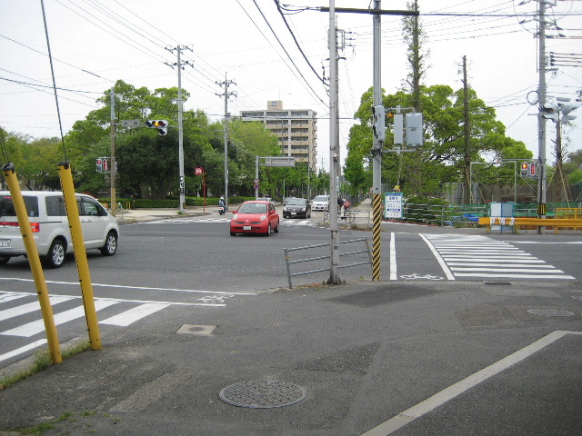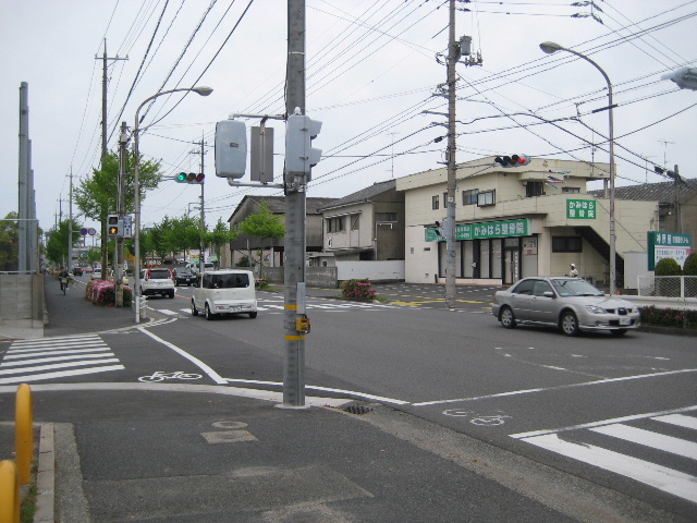 写真では同じくらいの幅の道の十字路に見えるが、左側から出てくる車は殆どない。それと言うのも主要な市道ながら左へ行く道の途中で車の通り抜けが困難な区間があるからだ。