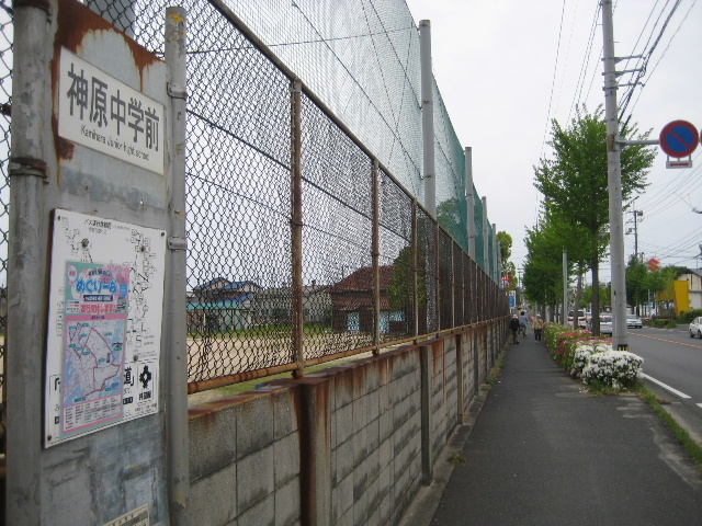 この交差点を過ぎると神原中学校のグラウンドが見えるようになる。交差点付近に神原中学校バス停がある。
