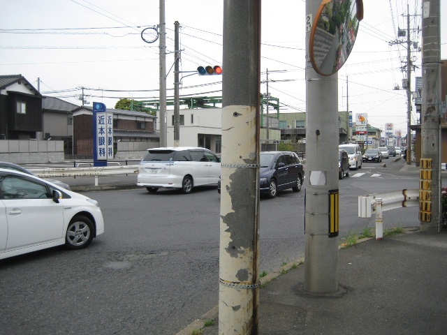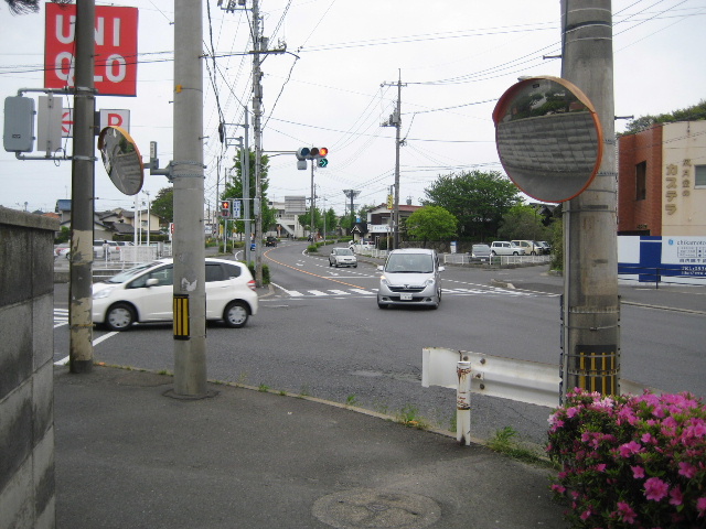 自歩道も交差点に沿って曲がっており、ブロック塀に遮られ見通しが悪いのでミラーが設置されている。