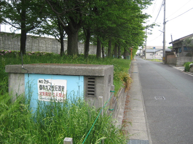市道神原町草江線の歩道より市道恩田則貞線を眺めている。都市ガス整圧器室があり、左手に球場の外壁が迫ってきている。球場の外壁に沿って銀杏並木の散歩道がある。