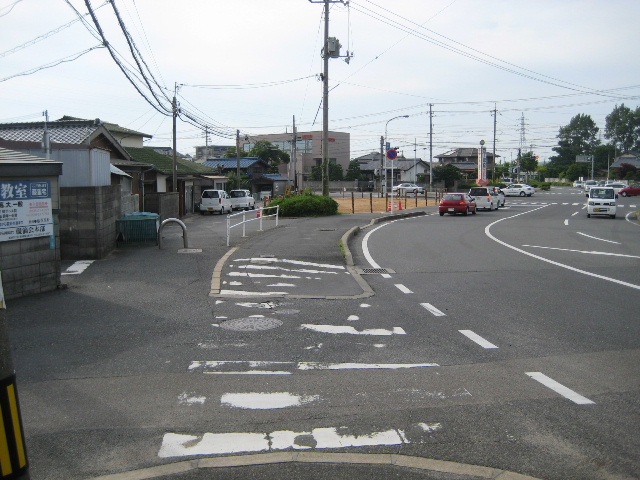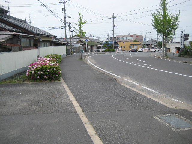 前方に歩道が見えており、その右側ラインが旧線の通りだ。