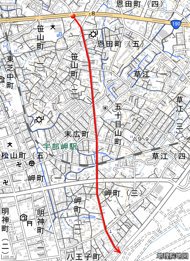 現在の経路を地理院地図に重ね描きした画像を示す。●は起点、矢印は終点を表している。