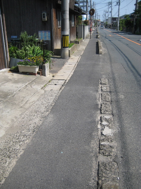 その店のすぐ横から左へ入る道がある。車での出入りを容易にするために歩車道境界ブロックが切り欠かれていた。
