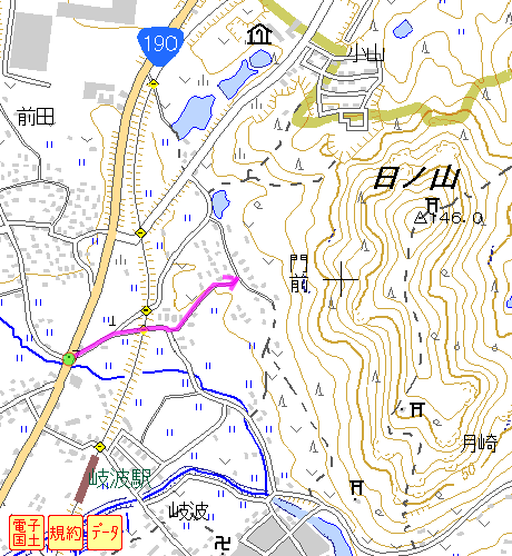 日ノ山にぶつかる寸前で、別の市道(岐波門前線)へT字路の形でぶつかり終点となった。