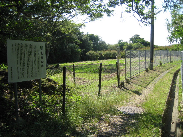 市道亀浦線の終点から更に海へ向かう里道を進むと右側に亀浦古墳がある。里道に沿って空き地が続き、その一番海側に土塁が遺っている。