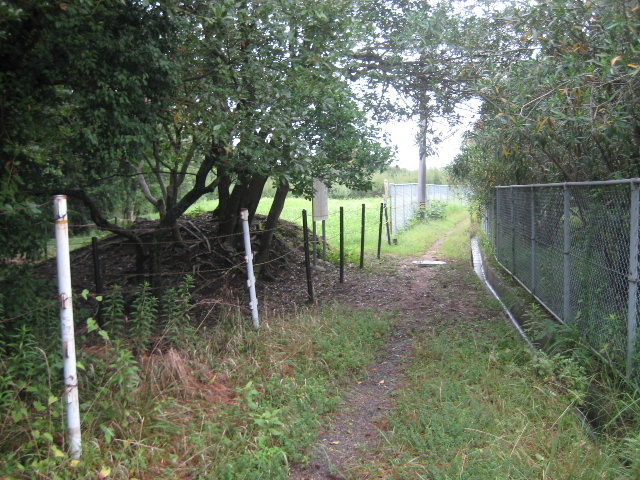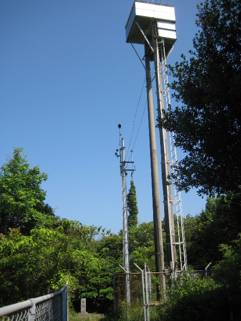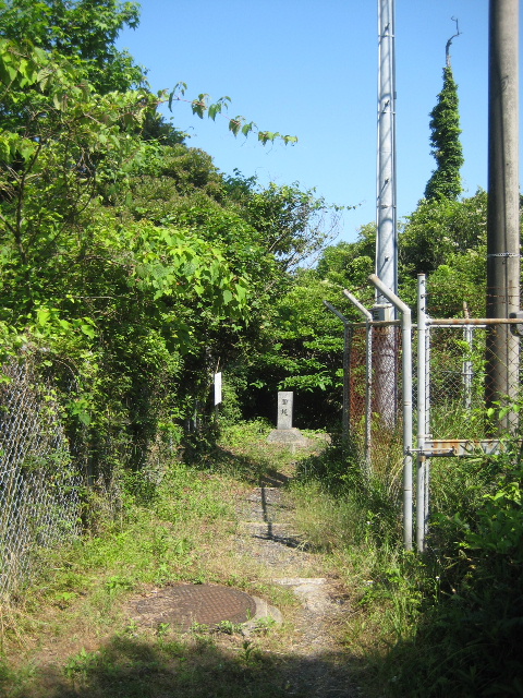 亀浦古墳から更に先へシングルトラックの道を進むと、正面に石柱が見えてくる。すぐ傍に携帯会社の電波塔と思われる塔が建っている。