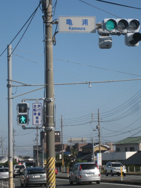 亀浦(かめうら)は市東部にある地名で、現在でも亀浦1〜4丁目として現在の住居表示の一部となっている。写真は国道190号亀浦交差点の地名表示板。