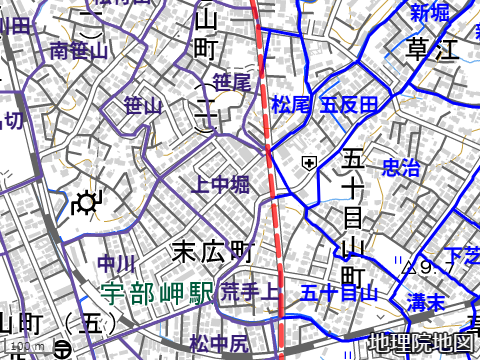 後期の小字絵図では、南北を通る市道恩田八王子線を境に東側のごく狭い三角形状領域が上中堀、その南側が荒手上で、メインの道を挟んで本路線が延びる側は末広町として記載されている。これは後期の小字絵図がこの周辺の住居表示後に作成されたからである。上記のマップは、それ以前の版の小字絵図を参照して住居表示以前の小字を推定で書き込んだものである。