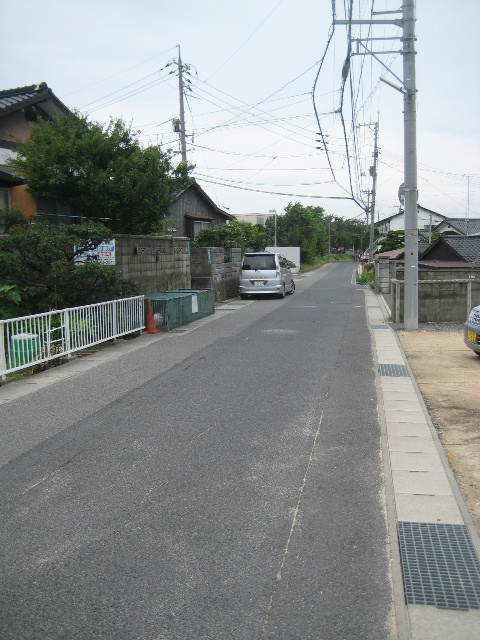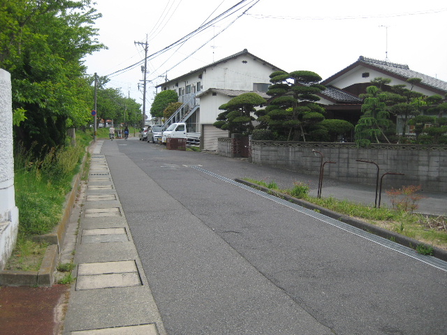 現在こそ左端は蓋付きの側溝が伸びているが、かつては雨水や生活排水を流す開渠だった。それは現在見えている場所で道路の下を横断し、右側に見えるゴミステーションの横の桝に排出されていた。(左側に布設された側溝の雨水は現在も道路横断のヒューム管を経て排水されている)