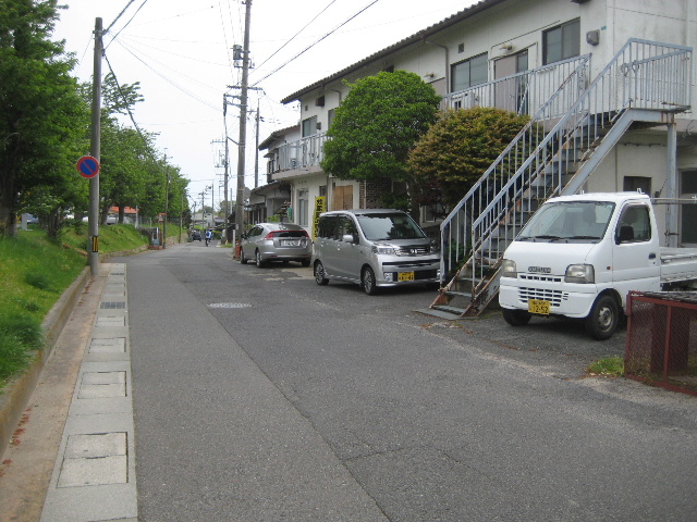 右側の真砂土が入った駐車スペースにもかつては平屋が建っていたが、30年位前に退去し空き屋のまま遺っていた。家が解かれた後、真砂土が入れられ区画ロープを張って月極駐車スペースとして供用されるようになった。