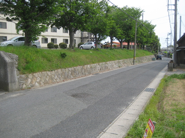 市道は終点に向かって僅かながら下っており、向かって左側の独身寮の敷地が一段高いので、石垣の高さが次第に高くなっていく。この状況は昔からまったく変わらない。左側に蓋付きの側溝を据え付けたために石垣の高さが低くなっている。かつて溝だった頃はこの倍近い高さがあった。私たちは手前左側の草の斜面を伝い、石垣の上を何処まで進むことができるか度胸試しに似た冒険ごっこをしていた。