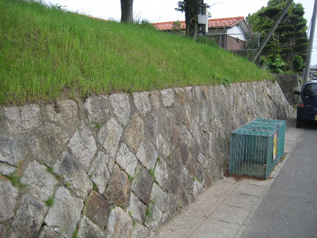 石積みの末端部分付近。側溝設置で見かけの高さは低くなってしまったが、それでも背丈以上の高さがある。