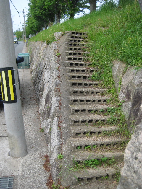 石垣の末端部分には、昇降用の建築ブロックで造られた階段があった。現在は階段の行き先がなく、いわゆるトマソンとなってしまっている。
