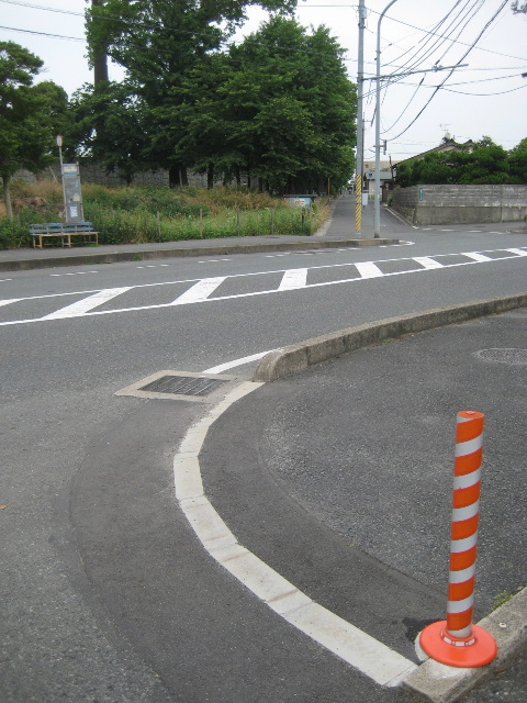 このすぐ先で交通量の極めて多いメインの道を横切るのだが、「道路交差部はなるべく直角に接続する」の方針にしたがい、接続部分がネジ曲げられている。