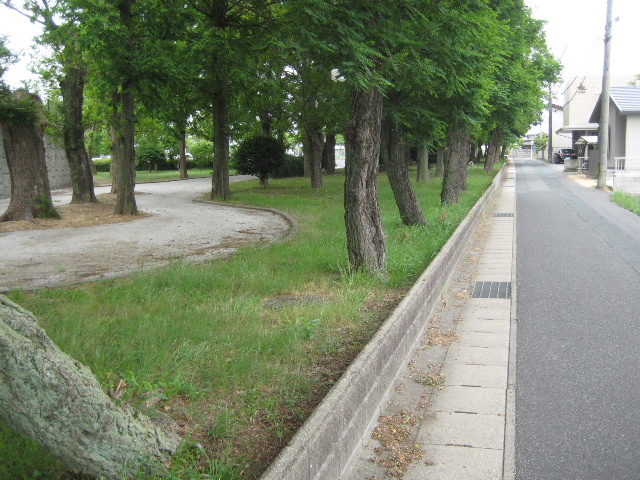 この右側は市道神原町草江線の枝線区間であり、左側は野球場の外側を通る散策路となっている。