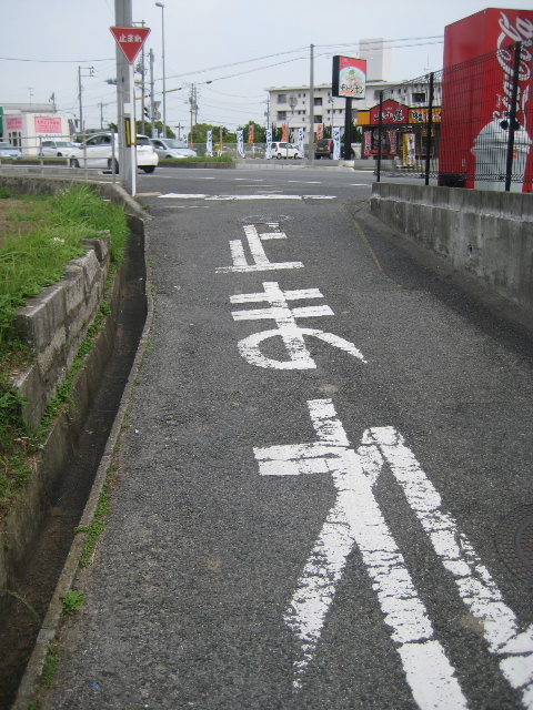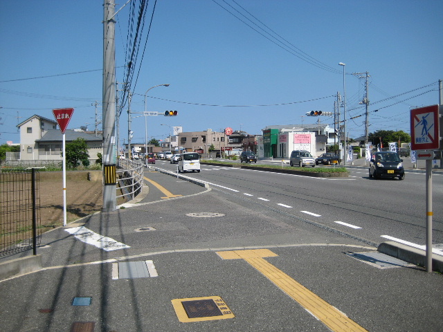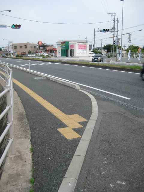 またしても斜めの接続で道路幅は狭く、交通量の多い国道へ合流する見極めもさることながら自歩道の通行者への注意も必要だ。