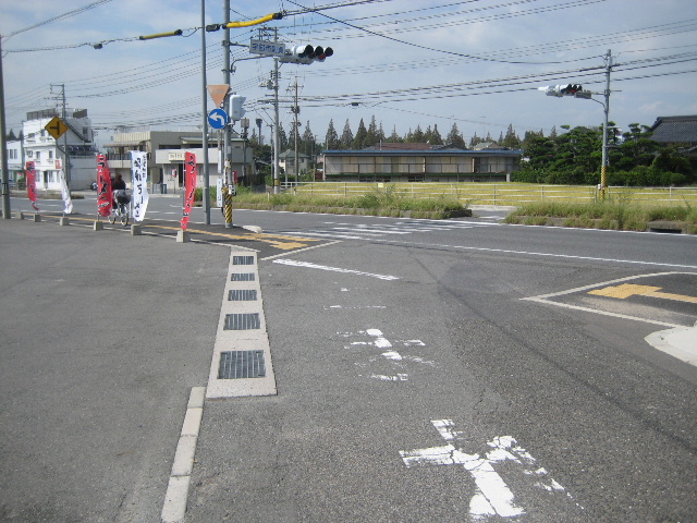 2枚上の写真を見ると、市道の進行方向から若干捻れた位置の中央分離帯が空いていることに気付くだろう。これは店舗への出入りおよび国道を常盤公園側から走ってきた車が右折して市道に入るためのものである。