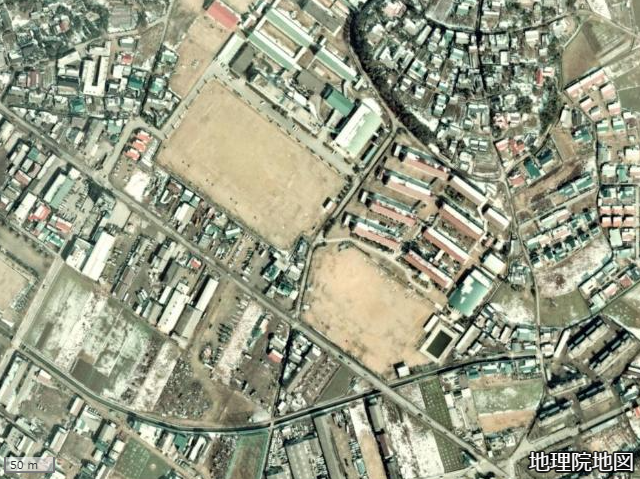 その後市道神原町草江線に直交する経路のみが残され、反対側にも中央高校の敷地となる長方形領域が確保されたとき、校内を横切る斜めのあぜ道は抹消されたようである。