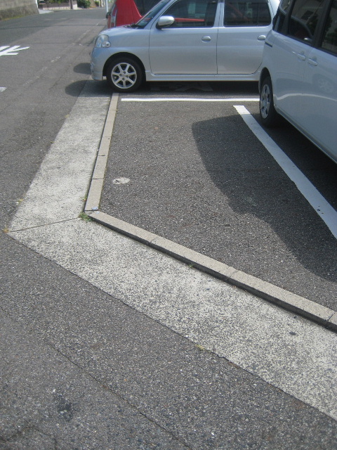 両方の市道が交わって生じる角っこの台形領域に普通車は入らない。軽四を停めるにも真横の車がキチンと枠内に駐車しているという前提で、タイヤが縁石の上に載っかる状況である。