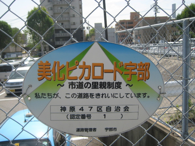 ”美化ピカロード宇部”と描かれた独特な楕円形の表示板は、車や自転車で市道を走っていて数ヶ所在り場所を確認している。市道宇部駅小野田線の終点付近に立っているのを見たし、市道高嶺中山線にはちょっと薄汚れた標示板があった。最近のレポートでは小羽山中央線の終点付近にも立っていた。美化ピカロード宇部とは、市の道路河川管理課が窓口となって、道路の清掃やごみ拾い、除草や花壇の世話などを行う”まち美化・アドプトプログラム”の一環のようである。