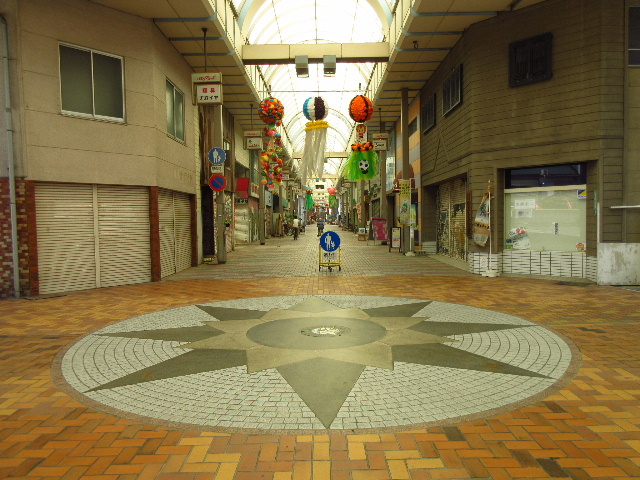 他の市道と交差する部分はアーケード通路部分とは異なるタイプのタイルが敷かれ、交差点の中央には東西南北を示すデザインが施されている。