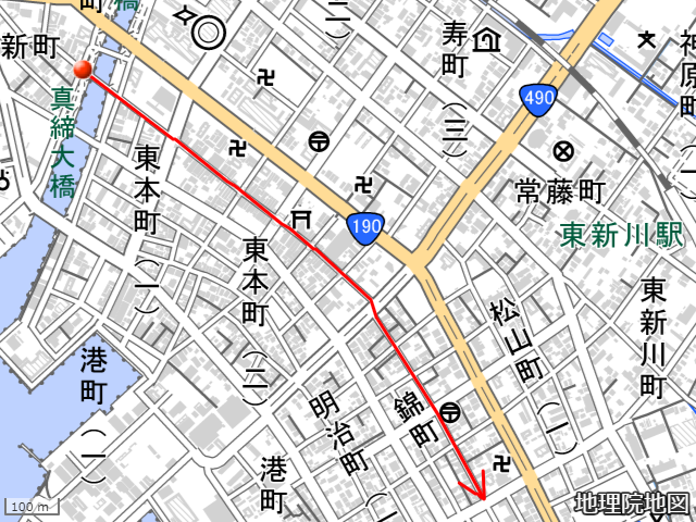 現在の経路を地理院地図に重ね描きした画像を示す。●は起点、矢印は終点を表している。