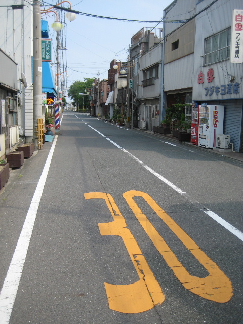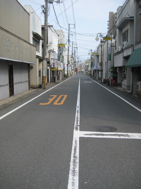 道の両側に商店が並びます。道幅は狭いのですが交通量はそれほどではありません。