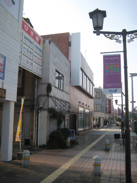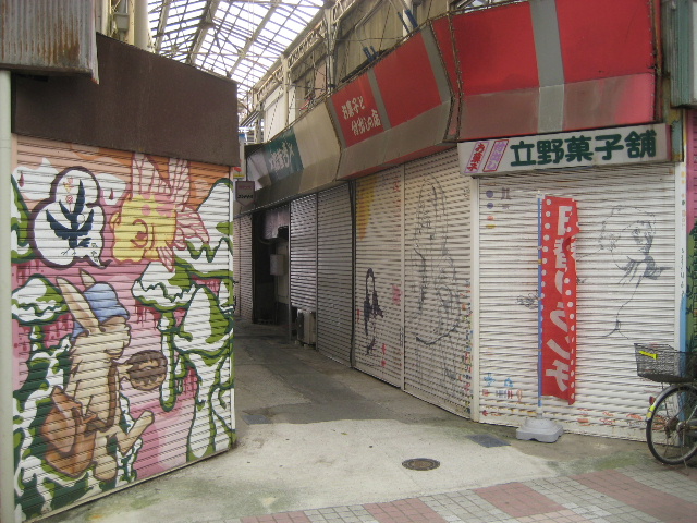 両側の店舗は休業中で、シャッターアートプロジェクトの一環としてペイントが施されている。