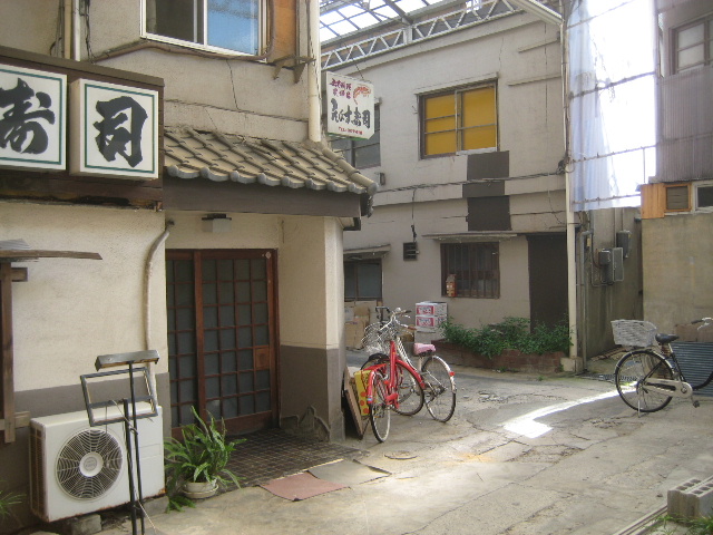 横町の名称はアーケード街から入ったとき正面に見えるこの寿司店に由来するらしい。実際、昔から営業している店だ。[2]