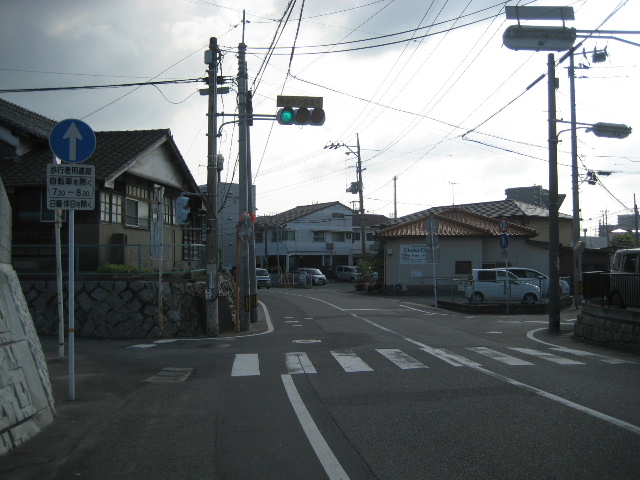 琴芝通りのこの近辺は対面通行の広さがあるのに対し、横断する両方の道ともかなり狭い。学校が近いことに配慮して、朝の時間帯は通行制限がかかる。琴芝通りに面して”直進のみ”の標識が出ている。[1]