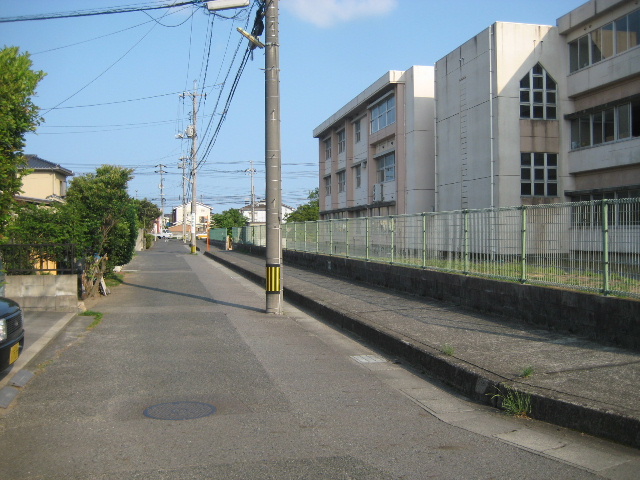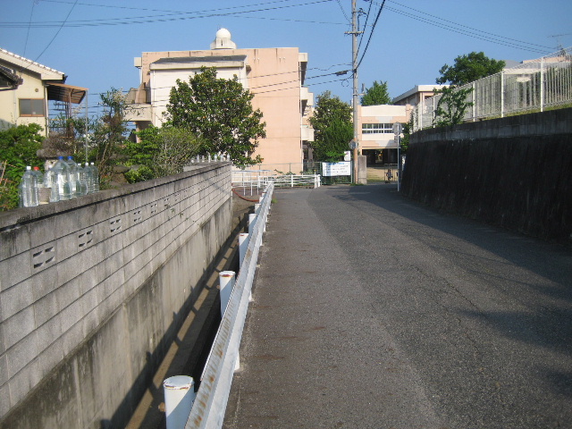 右側に琴芝小学校校舎の裏側を眺めながら進む。登下校で子どもが通ることを考慮して歩道部分が一段高くなっており、しかもかなり広い。