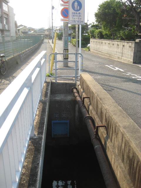 こんな狭い橋を車と登下校の子どもたちが安全に共有できる筈もないので、歩行者用の橋が別途設置されている。恐らく当初はコンクリート床版だけで、後から追加設置されたのだろう。[2]