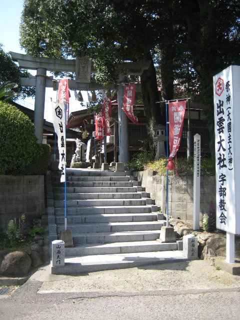 本路線の起点から最初の坂を登ったところ左側に出雲大社の宇部教会がある。(訪れたのは一年前…時期柄節分祭の幟が出ていた)