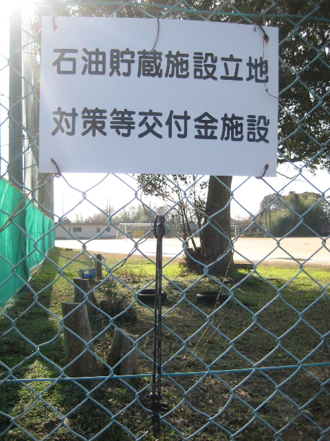 このグラウンドのフェンスに「石油貯蔵施設立地対策等交付金施設」と書かれた札が下がっている。