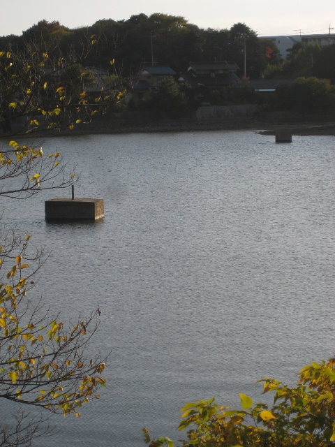 鮮明ではないが、航空映像で偶然見つけたそれが「確かに実態を持つ何か」であると裏付ける写真の撮影ができた。もっとも距離が遠く、正体の解明には程遠かった。なお、更に水位が低いときには上記の物件より更に手前の半島の先にコンクリート塊が観察される。[2010/11/23]