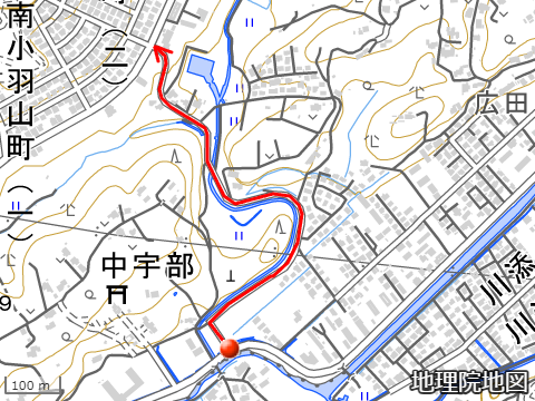 現在の経路を地理院地図に重ね描きした画像を示す。●は起点、矢印は終点を表している。