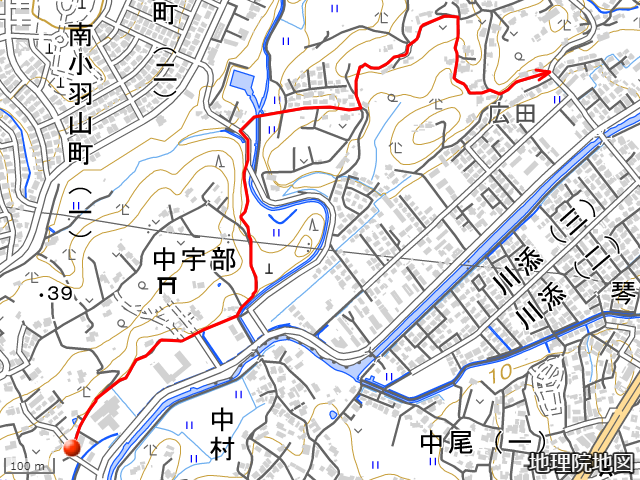 現在の経路を地理院地図に重ね描きした画像を示す。●は起点、矢印は終点を表している。