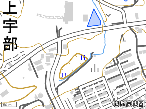 内側に向いて短い垂直線がくっつく等高線は、その場所が低くなっていることを示す。いわゆる窪地である。地図上で見られる窪地の代表的なパターンは概ね2通りで、秋吉台のドリーねのように自然現象によって形成されたもの、採石場などで広範囲にわたり人工的な採掘を行って生じた跡地だ。例えばここから市道小羽山中央線を挟んだ西側は広大な採石場になっており、深い窪地になっている。しかしこの場所にある窪地の特異性は、そのいずれでもないと思われる点にある。