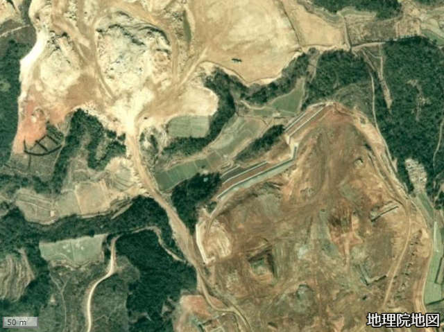自然に生じた窪地なら、普通は水が溜まって池になるだろう。しかし実際は水田の記号が描かれていることから、市道小羽山中央線の下をくぐる排水路が存在している筈だ。恐らくかつては採石場の方まで伸びる沢地だったのだが、市道小羽山中央線を通す盛土で分断されたのだろう。