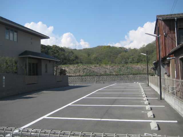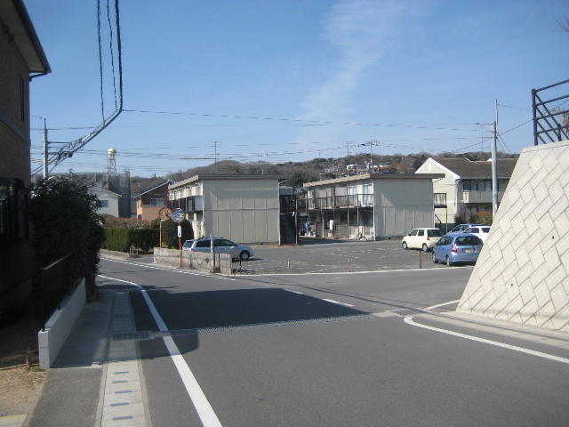 この辺りから右側、駐車場の奥に土手のようなものが見えている。