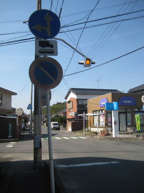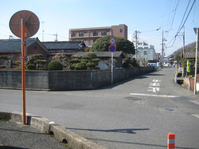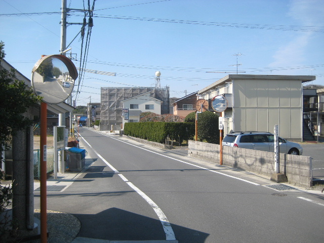 市道小松原桃山線からここで右折する場合は、かならず一旦停止が必須となる。ミラー頼りで右折するのは昼間よりもライトが頼りにできる夜の方が容易だ。