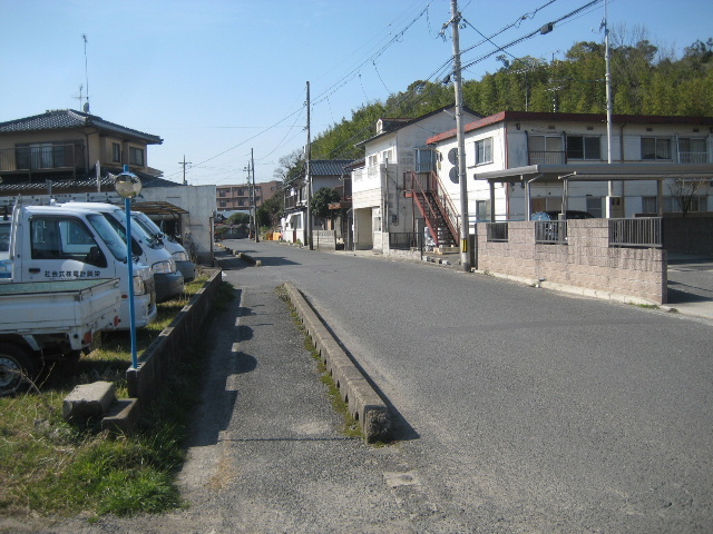 さて、道は平坦だが進行方向右側に雑木の目立つ丘陵部が近づいてくる。家が並んでいるので気付かないかも知れない。