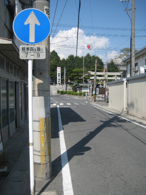 西宮八幡宮が見え始めた頃、前方で更に細い道と交差する。通学路なので朝の時間帯は四輪が進入できない制限がかかる。