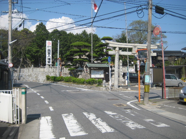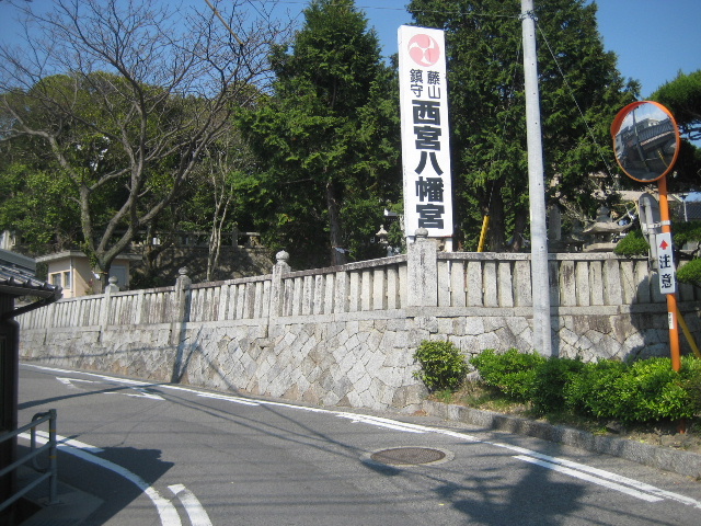 スタート直後から直線的に進んできた市道は、西宮八幡宮の鳥居を前にして初めて左へ軽く曲がる。即ち起点からでも鳥居が真っ正面に見えるような位置にある。西宮八幡宮の由来についてはまだ調べていないが、それほど昔から重要な鎮守だったことが窺える。