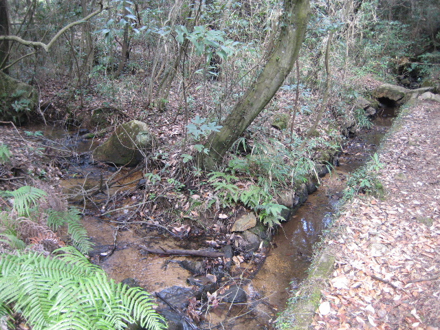 このすぐ先で水路の片側のみがコンクリート壁になり、別の水系が流入してくる場所に出会う。この水系は人の手が入らない自然の小川である。
